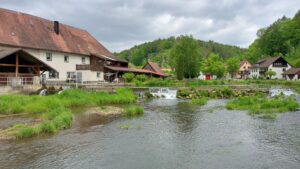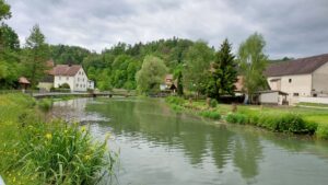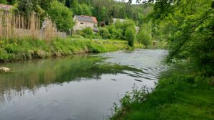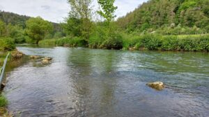 Am nächsten Morgen machte ich mit dem Rad auf den Weg und erforschte die Gegend und nutzte den Radweg an der Wiesent entlang. Der Fluss ist wirklich wunderschön und das Wasser sehr sauber. Die Forellen sieht man schon vom Ufer aus, wenn man sich vorsichtig anpirscht. Also hier wollte ich unbedingt fischen. Zumal man keine Watkleidung benötigt, man kann sehr gut vom Ufer aus fischen, da das Ufer oft an Wiesen grenzt, ohne Baumbestand. Also ging ich zur Touristen Info und erwarb für stolze 30 Euro einen Tagesschein für die Stadtstrecke, für den nächsten Tag. Alle anderen Strecken sind in privater Hand und dort bekommt man häufig nur einen Tagesschein, wenn man in der dortigen Pension übernachtet.
