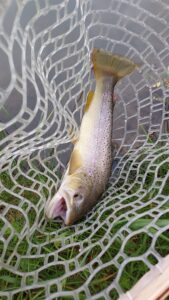 Nach etwas Ruhe, ging ich wieder los, da ich unbedingt noch eine Äsche fangen wollte. Dies gelang mir leider nicht mehr, aber insgesamt waren es eine Regebogenforelle eine Bachforelle und eine dritte hatte ich gehakt, aber kurz vor dem Landen ist sie mir dann entwischt. Da ich mit Fliegen ohne Widerhaken fische kann das schon mal passieren, wenn man die Schnur nicht immer unter Spannung hält. Die Forelle zieht schon ordentlich an der Schnur, da macht der Drill schon sehr viel Spaß. Alles in Allem ein toller Tag. Die Wiesent ist wirklich ein Traum zum Fliegenfischen. Solltet Ihr Fragen habe, meldet Euch.